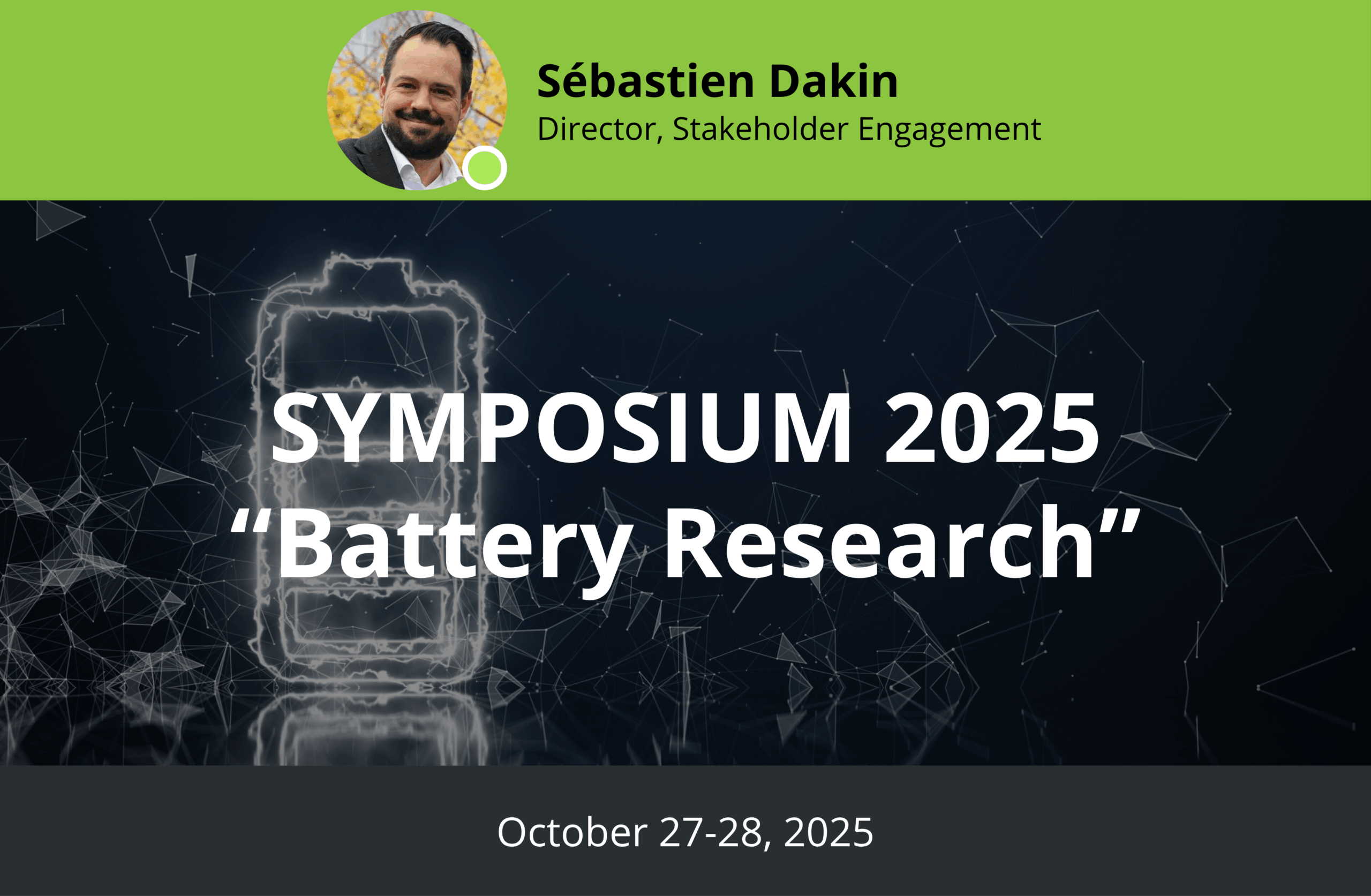 Our Director of Stakeholder Engagement, Sébastien Dakin, will be speaking on the panel “Challenges and Opportunities for Financing” at SYMPOSIUM 2025: Battery Research, taking place on October 27–28, 2025.